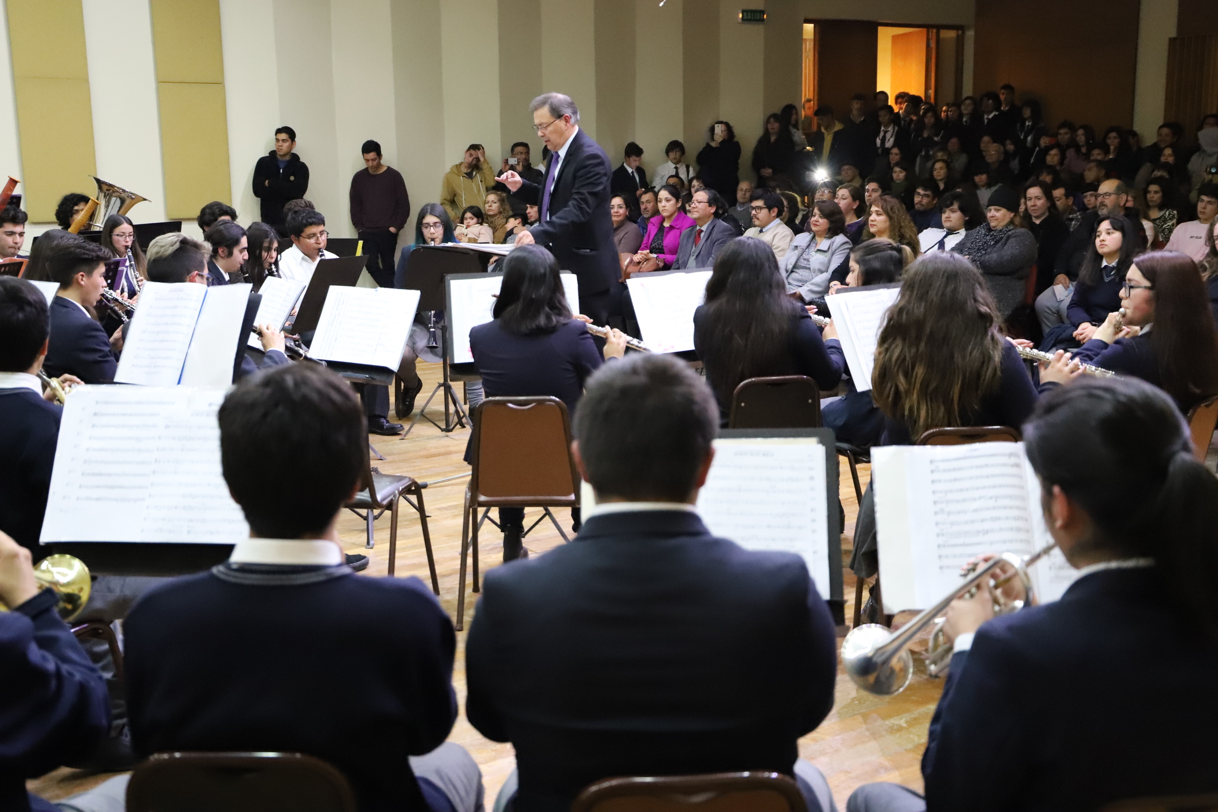 Estudiantes desde 1ero a 3ero medio, en compañía de otros ex estudiantes del plantel musical presentaron un audaz repertorio, con obras europeas, chilenas y latinoamericanas. El director del conjunto juvenil, el profesor de trompeta, Sergio Fuentes Inostroza, se mostró emocionado con el resultado logrado después de un semestre cargado de conocimientos: “me siento sumamente feliz por el resultado de hoy, de haber hecho algo maravilloso con estos jóvenes. Hemos trabajado duro para llegar a este punto, muchas veces cuesta, pero hay que entregarse a la causa de buscar la belleza de la música, y lograr que los estudiantes puedan sentir la música y tocar y expresar lo aprendido, esa es mi forma de trabajar”, expresó.