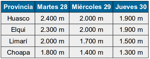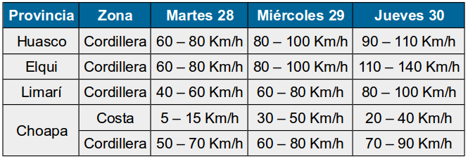 En la provincia de Huasco, en la Región de Atacama, este sistema frontal estaría afectando entre los días miércoles 29 y jueves 30 en los sectores precordilleranos y cordilleranos.