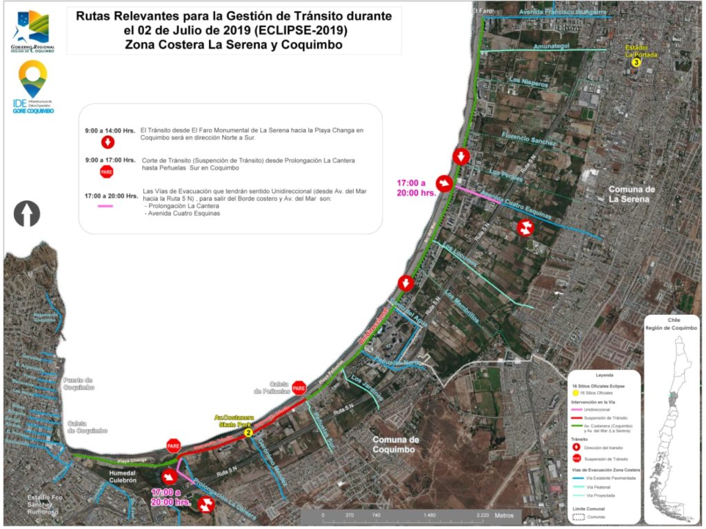 Al respecto la autoridad señaló que se presentó un mapa donde hemos dado cuenta de las acciones a realizar en el tema vial que vamos a realizar, “por ejemplo habrá unidirecccionalidad desde el Faro monumental hasta a Avenida Peñuelas Sur desde las 9:00 a 14:00 hrs, mientras que en el tramo de Peñuelas Sur y el eje la Cantera estará suspendida la circulación de móviles desde las 9 a 17 hrs, importante señalar que entre las 14 y 17 horas habrá suspensión TOTAL de la circulación en toda la Avenida del Mar de La Serena y Costanera de Coquimbo, circulación que vuelve en forma normal desde las 17 hrs”.
