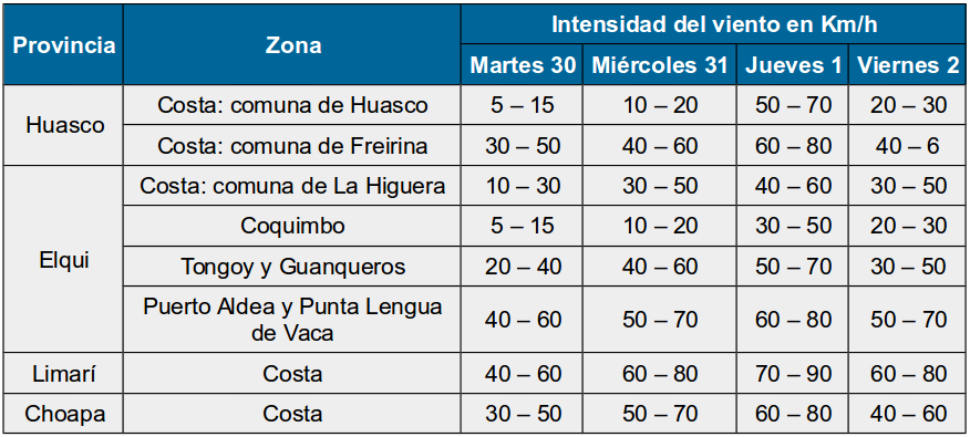 Los vientos más intensos se registrarán en la costa de la provincia de Limarí, los que podrían llegar a los 90 Km/h. Por su parte la costa de la comuna de Huasco sólo registraría temporal de viento durante el jueves 1.
