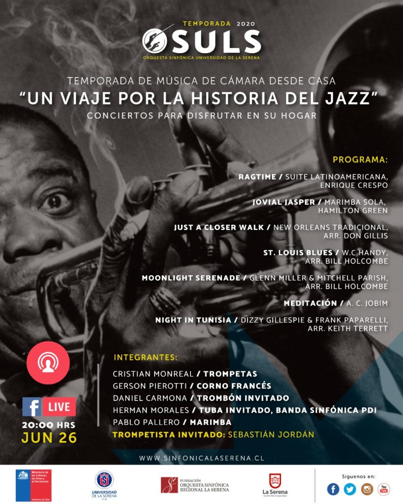 Dicha propuesta artística se inaugura este mes con el I Concierto de Música de Cámara denominado ‘Un viaje por la historia del Jazz’; el cual será transmitido por Facebook Live (@Orquesta Sinfónica Universidad de La Serena) el viernes 26 de junio a las 20:00 horas. El programa estará a cargo del cuerpo de percusión y bronces del conjunto sinfónico: Pablo Pallero (marimba), Cristian Monreal (trompetas), Gerson Pierotti (corno francés) y como músicos invitados, en esta ocasión estará el destacadísimo músico nacional Sebastián Jordán (trompeta), Daniel Carmona (trombón) y Herman Morales (tuba, Banda Sinfónica PDI) quienes darán vida a una serie de siete imperdibles piezas; entre las que destacan ‘Ragtime – Suite Latinoamericana’ (Enrique Crespo), ‘Jovial Jasper’ para marimba sola (Hamilton Green), ‘St. Louis Blues’ y ‘Moonlight Serenade’ (arreglos Bill Holcombe), entre otras.