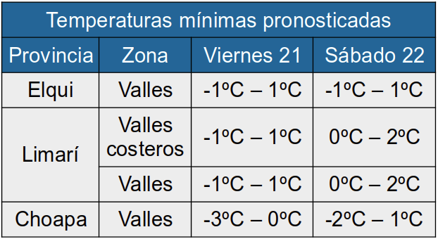 De acuerdo a lo publicado por CEAZAMet, se espera que continúen las bajas temperaturas y las heladas locales en los valles de la Región de Coquimbo, así como también en los valles más cercanos a la costa de la provincia de Limarí, hasta el sábado 22 de agosto.