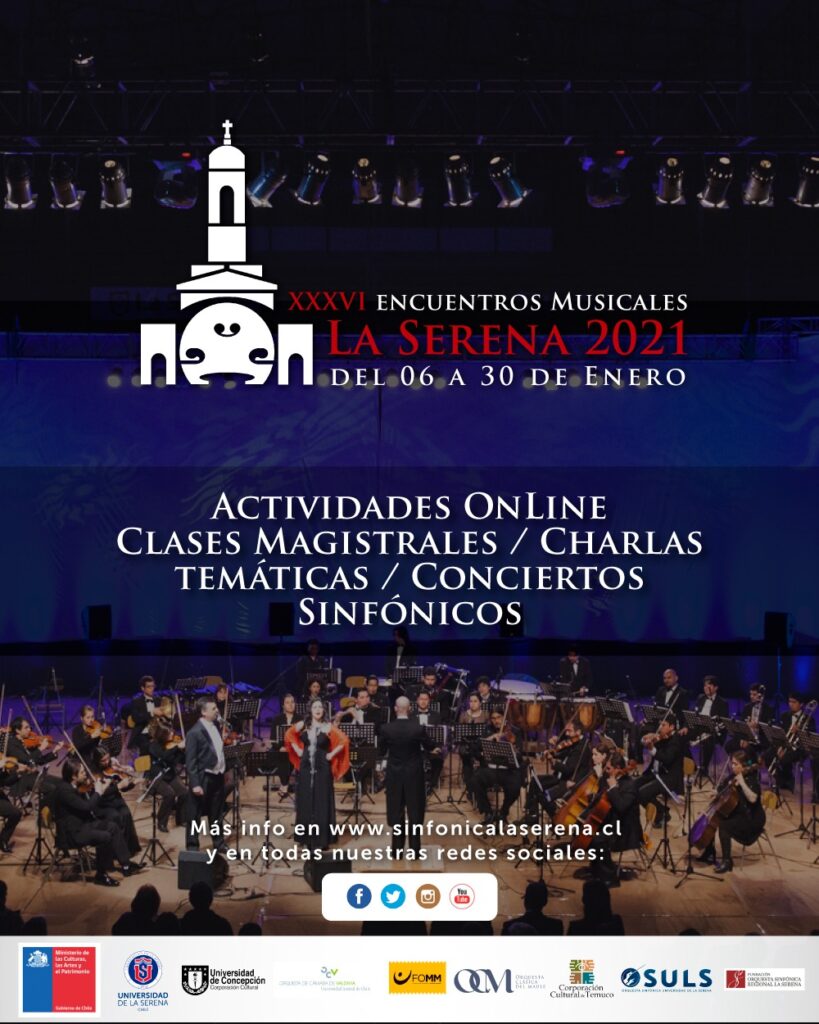 Durante todo el mes de enero del 2021 la Orquesta Sinfónica Universidad de La Serena estará realizando la XXXVI versión de los Encuentros Musicales de La Serena que, en esta oportunidad, serán transmitida por primera vez de forma remota. Un tradicional evento de factura regional que data desde 1984, gracias a la gestión realizada por el destacado Director de Orquesta, Gestor Musical y Maestro Fernando Rosas, que ha llevado a la ciudad de los campanarios a llenarse de música, conocimiento y cultura.