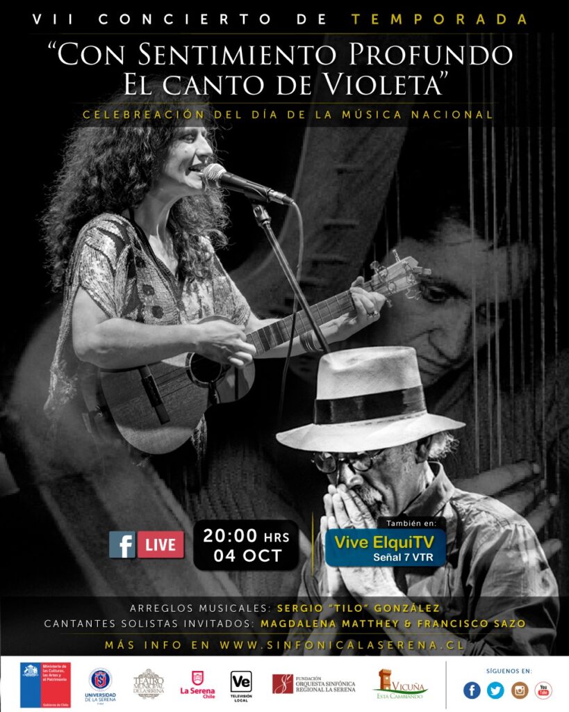 Por su parte, el Seremi de las Culturas, las Artes y el Patrimonio Región de Coquimbo, Francisco Varas Campos, sostuvo que “octubre es el Mes de la Música y la Orquesta Sinfónica Universidad de La Serena nos tiene preparada una tremenda sorpresa con la que busca recordar a la gran Violeta Parra, y reconocer a todos los músicos de Chile y la Región de Coquimbo. Será, sin duda, una gran velada musical que la comunidad podrá disfrutar a través de Facebook Live y televisión regional, así que invitamos a todas y todos a sumarse a esta imperdible transmisión”, enfatizó la autoridad local de cultura.