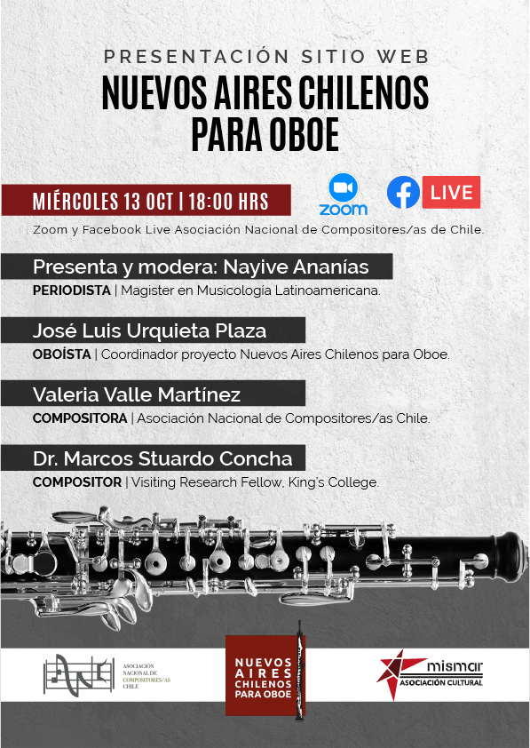 El sitio web ‘Nuevos Aires Chilenos para Oboe’ será presentado oficialmente este miércoles 13 de octubre a las 18:00 horas, vía Zoom y Facebook Live de la Asociación Nacional de Compositores y Compositoras de Chile, poniendo a disposición de la comunidad musical información de las obras, sus creadoras y creadores, así como también, novedades sobre estrenos y publicaciones de este material.