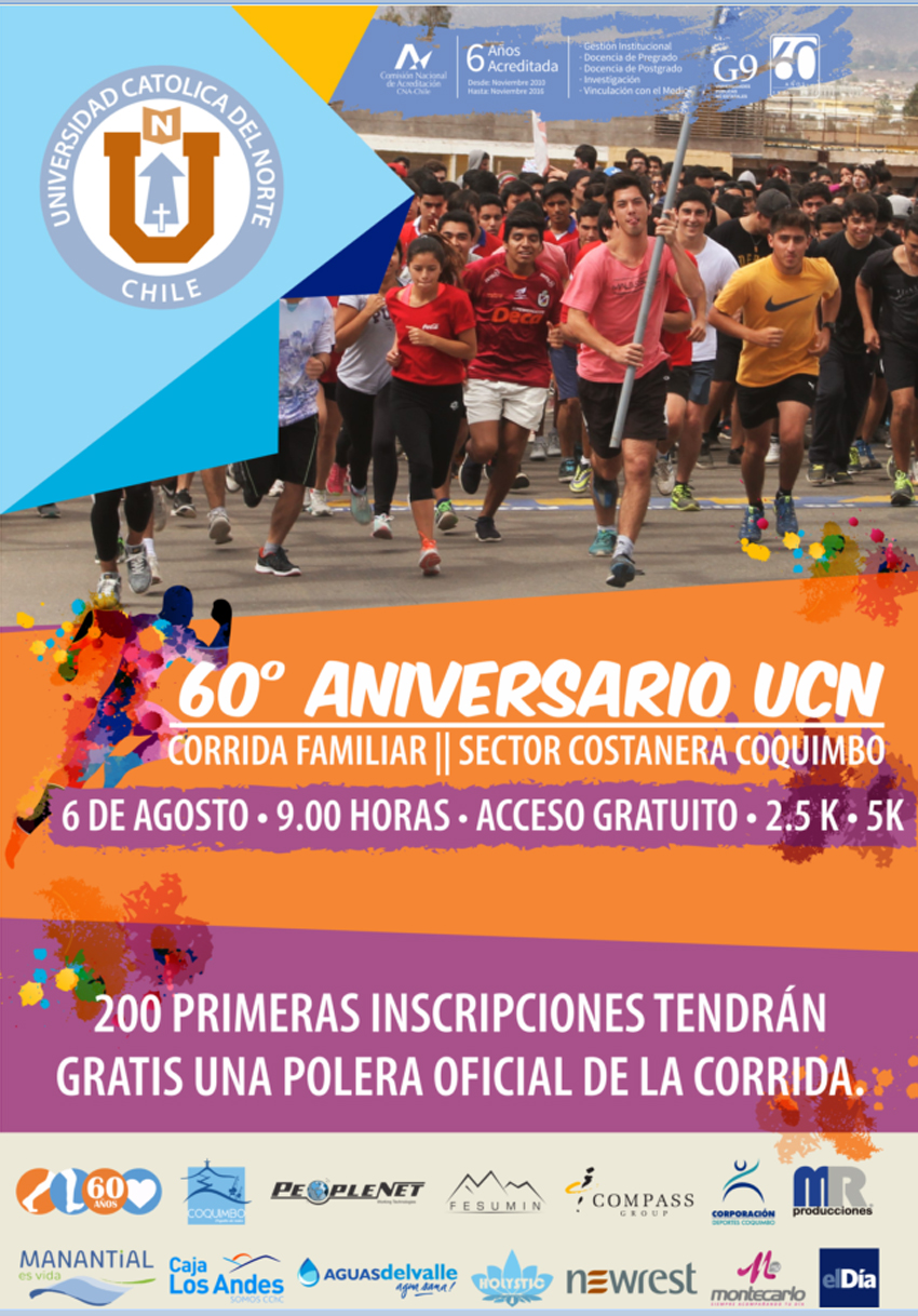 En el marco de sus actividades de aniversario, la Universidad Católica del Norte está organizando la “Corrida 60 años UCN”, evento de carácter deportivo competitivo-recreativo que se realizará el próximo sábado, 6 de agosto, en el sector de la Costanera de Coquimbo.