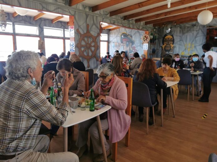 Con alegría, regocijo y mucho entusiasmo, 37 adultos mayores de diferentes sectores de la comuna de Coquimbo, llegaron a las dependencias del Restaurant La Caverna de Jhonny, socio de la Corporación Municipal de Turismo, para disfrutar de un rico almuerzo gratuito, acción que se enmarca en las tres “jornadas solidarias” que inició la propietaria Lorena López Parra, para conmemorar a los “abuelos” en el mes de agosto, público objetivo que ha sido uno de los más afectados por los efectos de la pandemia.