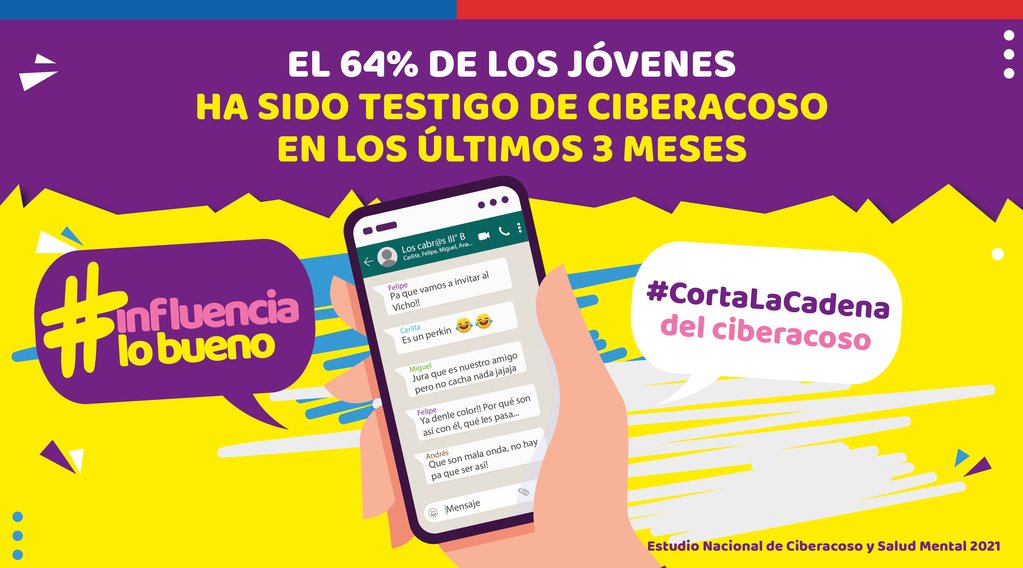 Según la Encuesta Nacional de Ciberacoso y Salud Mental 2021, un 47% de los jóvenes entre 15 a 29 años afirma haber sido víctima de violencia digital en los últimos tres meses y un 64% consigna haber sido testigo de esta práctica. La campaña encabezada por el Ministro Jaime Bellolio invita a cortar la cadena de la violencia en redes sociales y entrega orientación para evitarla.