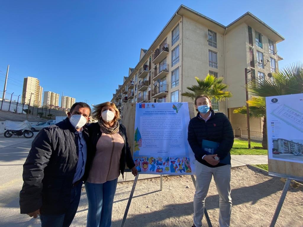Con la firma del acta de entrega del terreno del condominio Doña Marina II entre el Seremi de Vivienda y el alcalde de Coquimbo, se dio el vamos oficial a los mejoramientos en tres condominios de vivienda social que beneficiarán a 466 familias coquimbanas, con una inversión de casi 2 mil millones de pesos.