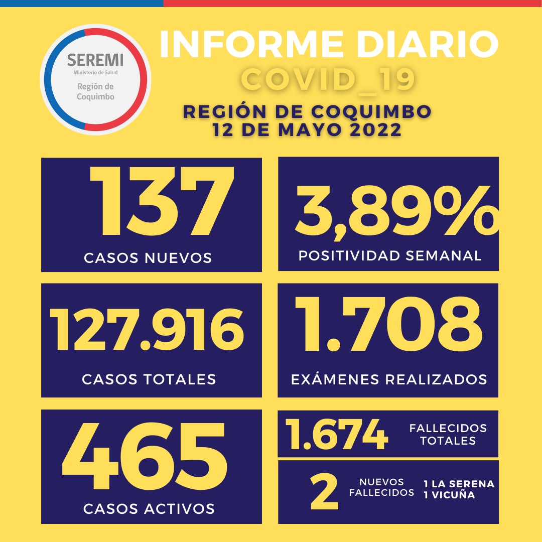 En relación al informe diario, se informaron 137 casos nuevos en la región. De ellos, 21 casos corresponden a la comuna de La Serena, 40 a Coquimbo, 1 de Andacollo, 4 a Paihuano, 1 a Vicuña, 18 a Illapel, 1 a Canela, 2 de Los Vilos, 3 a Salamanca, 10 a Ovalle, 2 a Combarbalá, 2 Monte Patria, 5 Punitaqui, 1 La Higuera, 9 a otra región y 17 casos sin notificar. Con esto, se contabilizan 127.916 casos totales acumulados, con 465 contagios activos a nivel regional.