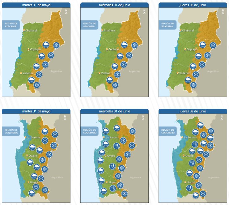 Se espera que durante el evento el nivel de isoterma cero fluctúe entre 1500 y 2900 msnm en la Región de Coquimbo (considerado por debajo del rango normal para esta época del año). Como consecuencia, es probable la ocurrencia de heladas en valles y precordillera durante miércoles 01 y jueves 02 de junio, con temperaturas por debajo de 2°C.