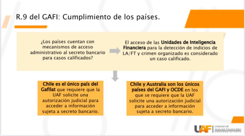 Durante la primera sesión de la Comisión de Economía del Senado, que comenzó la tramitación del proyecto de ley que permite levantar el secreto bancario de autoridades de gobierno, parlamentarios y altos mandos de las Fuerzas Armadas y de Orden, el director de la Unidad de Análisis Financiero (UAF), Carlos Pavez, entregó un dato alarmante: Chile y Australia son los únicos países del Grupo de Acción Financiera Internacional (GAFI) y de la OCDE donde aún se exige una autorización judicial para que la UAF pueda acceder a información sujeta a secreto bancario.