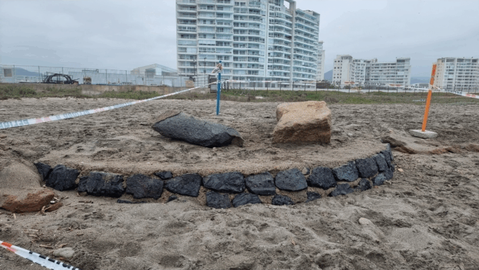 A tan solo unos 500 metros al norte del Faro Monumental, la arena de la Avenida del Mar decidió revelar un secreto. Lo que parecía una simple hilera de piedras resultó ser parte de una estructura en forma de herradura, construida con roca lítica y unida con escoria —el residuo de antiguas fundiciones—, un detalle que ha dejado a expertos tan fascinados como desconcertados.