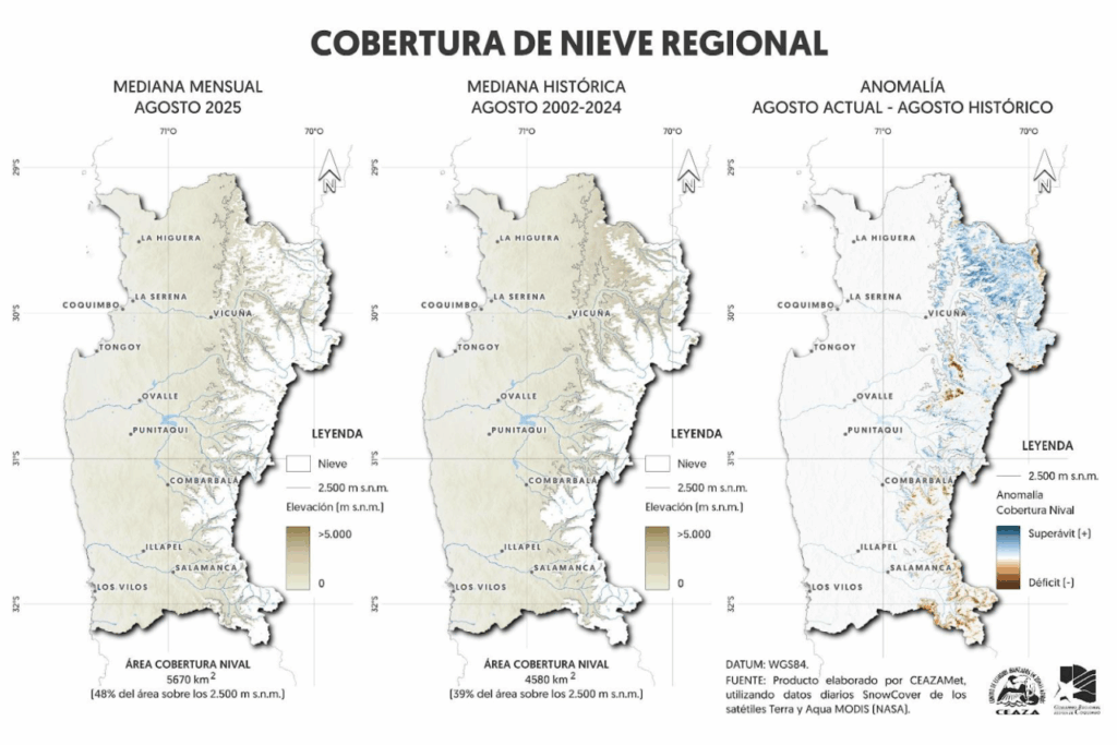 PRECIPITACIONES: El paso de dos sistemas frontales y dos bajas segregadas contribuyó a reducir el déficit hídrico. Sin embargo, a nivel provincial y regional, este aún persiste, con promedios de 18% en Elqui y 12% en Limarí y Choapa. Por otro lado, al cierre de agosto, la cobertura nival en la cordillera de la provincia de Elqui presentó un aumento significativo, favorecida por el paso de un núcleo frío en altura hacia finales de mes.