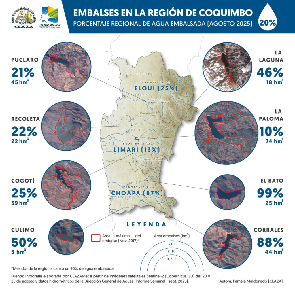 EMBALSES: El agua embalsada en Elqui es de un 25% con respecto a su capacidad, en Limarí de un 13% y en Choapa de un 87%. La región alcanza un 20% de agua embalsada con respecto a su capacidad.