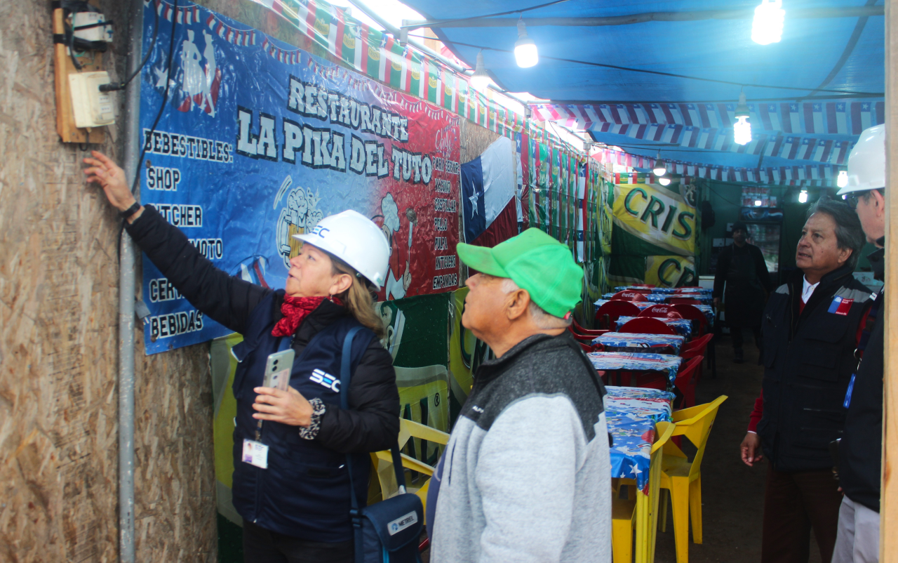 La fiscalización – en el marco del Plan del Gobierno Por un 18 Seguro – consideró una inspección de los tableros eléctricos y las conexiones de gas licuado en el sector del comercio, carros de comida y cocinerías, detectando situaciones por corregir por parte de los fonderos que se instalarán hasta el domingo 21.