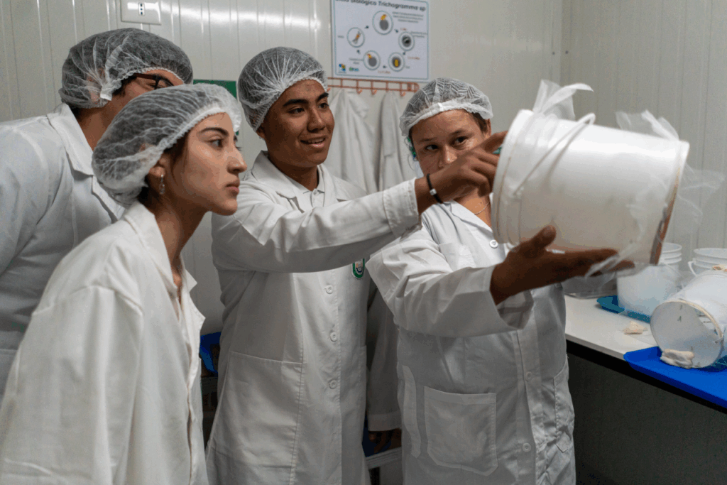 “Les enseño cómo alimentarlos, la forma de liberarlos en el campo y el ciclo de vida de cada insecto con los distintos procesos que se llevan a cabo”, indica Leidy Navarro, quien es la encargada técnica de la biofábrica y realiza un acompañamiento en el aprendizaje de los alumnos que se desempeñan allí.