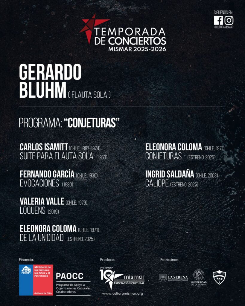 La Asociación Cultural Mismar continúa su Temporada de Conciertos 2025–2026 con la participación del destacado flautista chileno Gerardo Bluhm, quien ofrecerá el recital “Conjeturas”, un programa que explora la tradición y las nuevas estéticas de la creación musical para flauta sola.