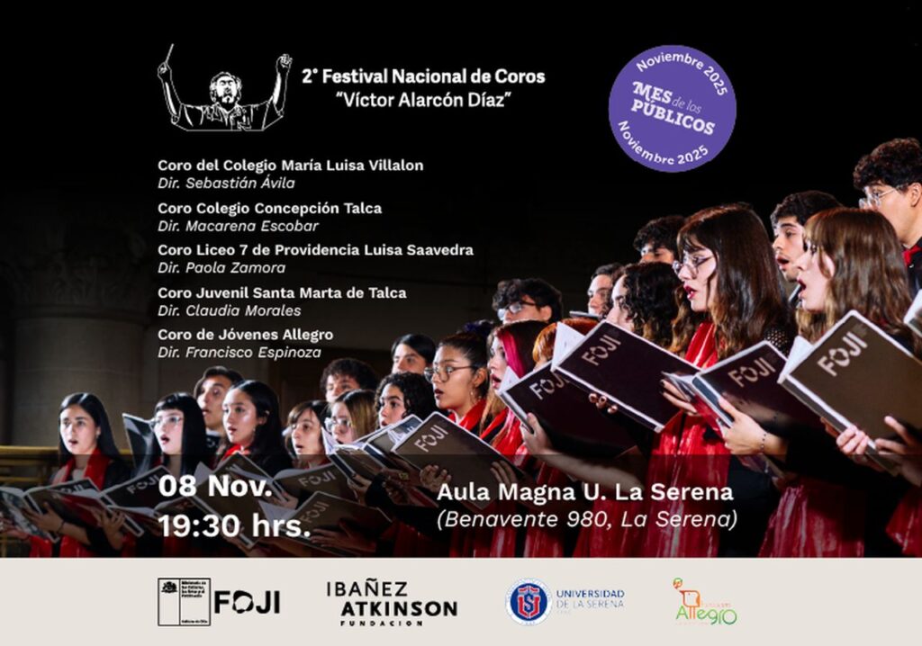 El sábado 8 de noviembre, el Aula Magna de la Universidad de La Serena será escenario de un evento inédito en la Región de Coquimbo. Se trata del 2° Festival Nacional de Coros Víctor Alarcón Díaz, evento organizado por la Fundación de Orquesta Juveniles e Infantiles de Chile (FOJI) en el marco del Mes de los Públicos 2025, iniciativa de la Unidad de Públicos y Territorios del Ministerio de las Culturas, Artes y Patrimonio.