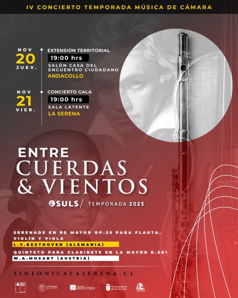 Un viaje al corazón del período clásico con obras de Beethoven y Mozart es el programa que marcará el último concierto de la temporada de música de cámara del elenco profesional este mes de noviembre, denominado ‘Entre cuerdas y vientos’. La cita contará con funciones gratuitas en la Casa del Encuentro Ciudadano en la ciudad de Andacollo y en La Serena en Sala Latente.