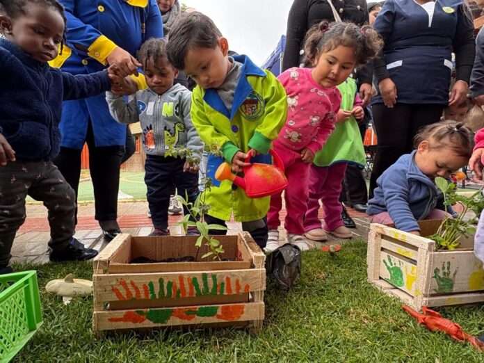 Como parte central de la jornada, niñas, niños, educadoras, familias y autoridades participaron en una acción simbólica donde plantaron flores y pequeñas hortalizas en maceteros reciclados elaborados por los propios párvulos.