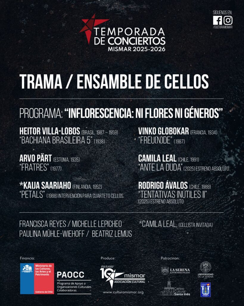 El programa de este concierto propone un recorrido sonoro múltiple y expansivo, inspirado en la idea botánica de la inflorescencia. Reúne obras de compositoras y compositores de diversos territorios y contextos, entre ellos Heitor Villa-Lobos (Brasil), Arvo Pärt (Estonia), Kaija Saariaho (Finlandia) y Vinko Globokar (Francia). A ello se suman dos estrenos absolutos de los creadores chilenos Rodrigo Ávalos y Camila Leal, siendo esta última una obra encargada especialmente por la Asociación Cultural Mismar para el Cuarteto Trama.