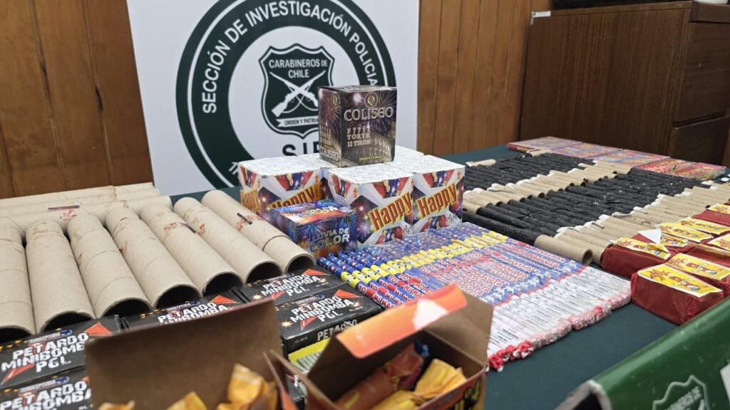 En el detalle, el decomiso corresponde a 6 cajas de fuego de artificio denominado tortas, 12 tronadores, 42 palmeras, 23 candelas, 19 metralletas, una caja de lluvia de color, 78 pilas, 10 doritos, 96 estrellitas y 2 cajas megatón.