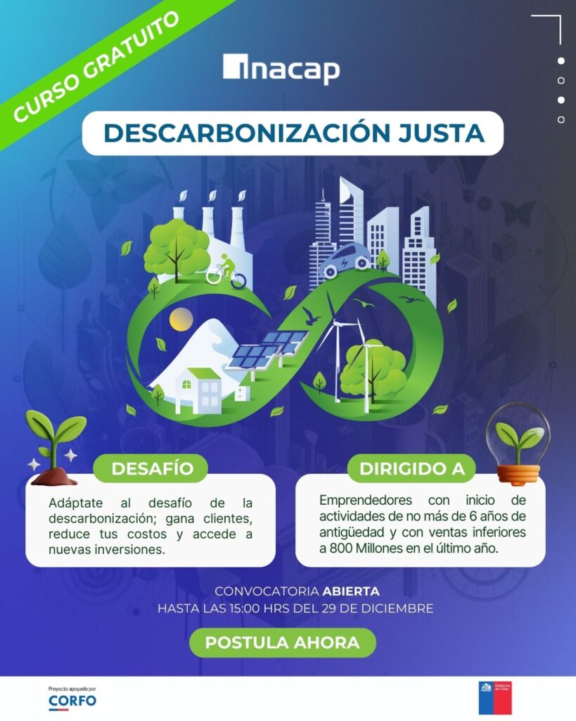 INACAP Sede La Serena, en alianza con CORFO Región de Coquimbo, anunciaron la apertura de postulaciones al Curso Avanzado en Descarbonización Justa, un programa intensivo, gratuito y de carácter estratégico, orientado a fortalecer las capacidades de emprendedores y profesionales frente a los desafíos del cambio climático y la sostenibilidad productiva.