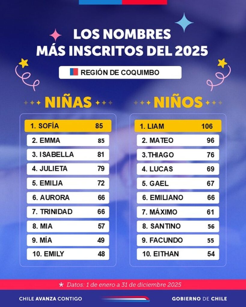 El Servicio de Registro Civil e Identificación dio a conocer el ranking de los nombres más inscritos en el país y en la Región de Coquimbo durante el año 2025, confirmando tendencias que se han mantenido con fuerza en la última década.
