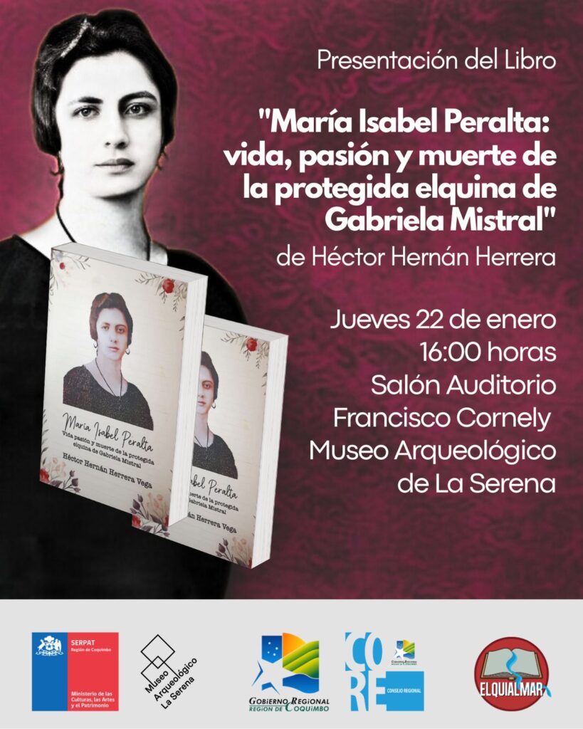 Luego de exitosas presentaciones realizadas en Vicuña y Montegrande, el investigador y escritor elquino Héctor Hernán Herrera Vega llegará este jueves 22 de enero, a las 16:00 horas, al Salón Auditorio Francisco Cornely del Museo Arqueológico de La Serena para presentar su libro “María Isabel Peralta: vida, pasión y muerte de la protegida elquina de Gabriela Mistral”. La actividad se inserta en el circuito regional de difusión de esta investigación dedicada a rescatar una figura clave del entorno mistraliano.