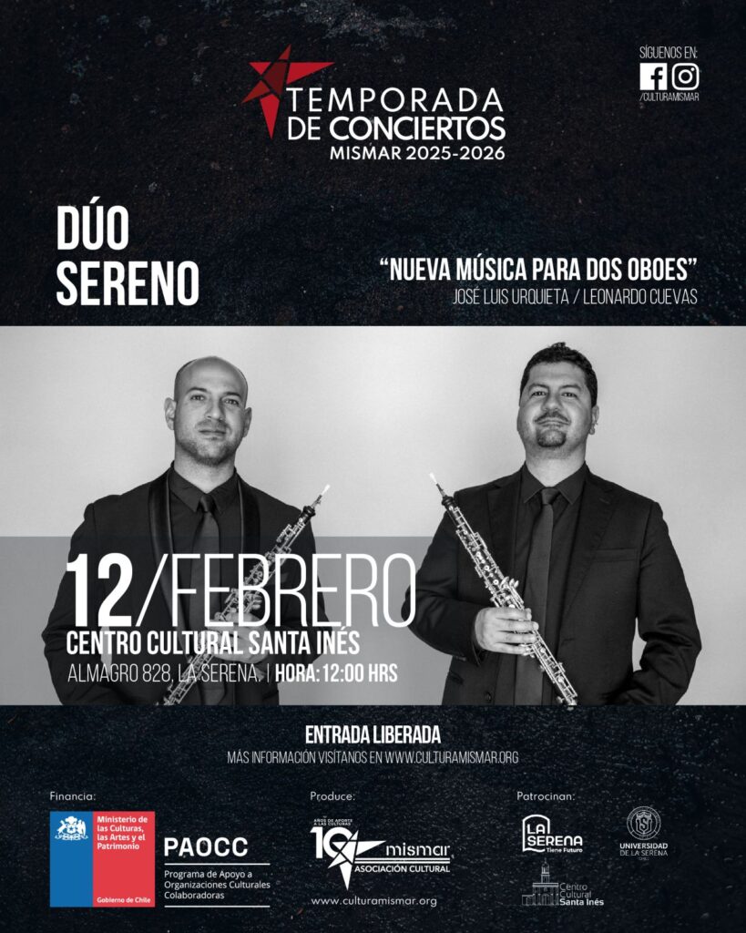 “Siempre es una alegría volver a La Serena y reencontrarme con el público de mi ciudad. Presentarnos con el Dúo Sereno en este concierto nos permite compartir parte del trabajo que hemos venido desarrollando y dar inicio a un año especialmente activo, que incluye nuestra participación en la segunda versión del concurso de composición ‘Jorge Urrutia Blondel’, una próxima gira internacional y nuevas comisiones impulsadas por la Asociación Cultural Mismar con el financiamiento de la Fundación Ernst von Siemens”.
