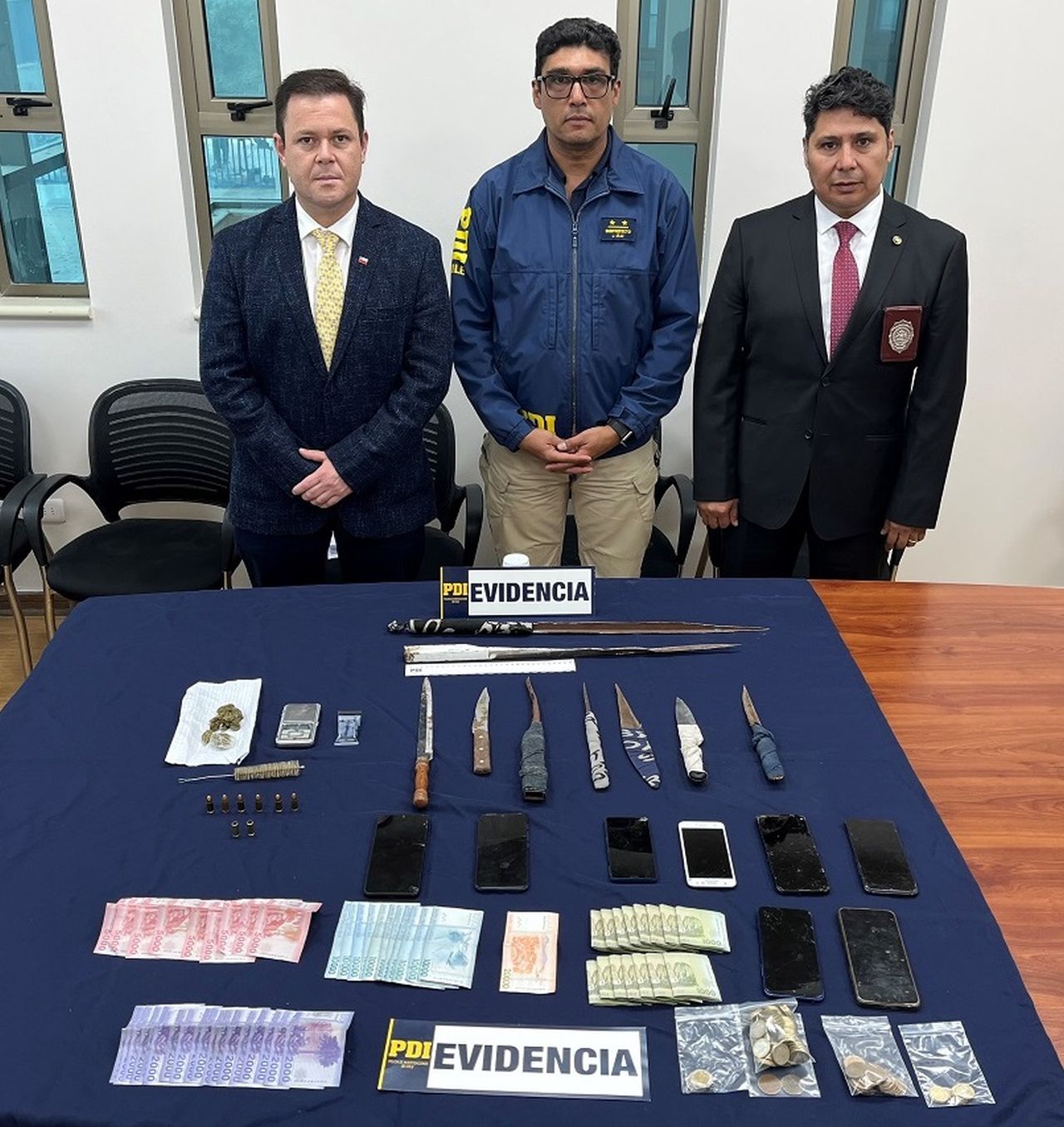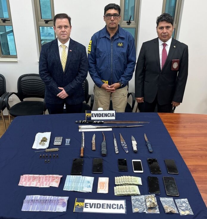 Como resultado del operativo, se logró la detención de tres personas, dos hombres y una mujer, todos de nacionalidad chilena, vinculados a la banda, además de la incautación de armas cortopunzantes, munición, sustancias ilícitas, equipos telefónicos móviles y dinero en efectivo, presumiblemente proveniente de la comercialización de drogas.