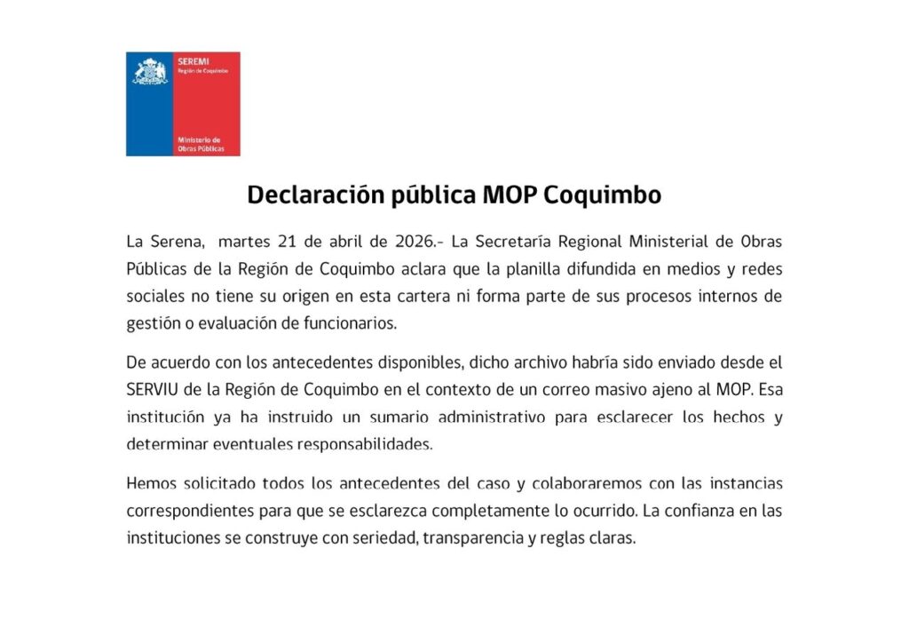 De acuerdo a una declaración pública emanada durante esta mañana de martes 21 de abril, desde la Secretaría Regional Ministerial de Obras Públicas de la Región de Coquimbo, indicó que el origen de esa planilla no forma parte de los procesos internos de evaluación de funcionarios.
